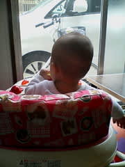 まだ早いかな~と思いながらも、試しに乗せてみたら、大喜び♪♪ ちゃんと足で踏ん張って、バック限定だけど移動できるんだよ!!