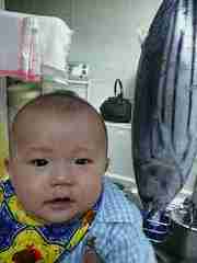 今日、カツオをいただきました これからタタキにして、夕飯の準備です うまくさばけるかな 不安・・・ 颯斗は、でっかい魚をみて、分かってるんだか興奮中
