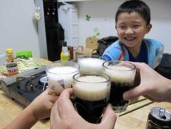 乾杯がすごく大好きな颯斗♪ こないだも、私の尊敬する先輩が我が家に来た時、乾杯を何度もせがんでおりました(^^) 大人は黒ビール♥ 子供は子供ビールで♡